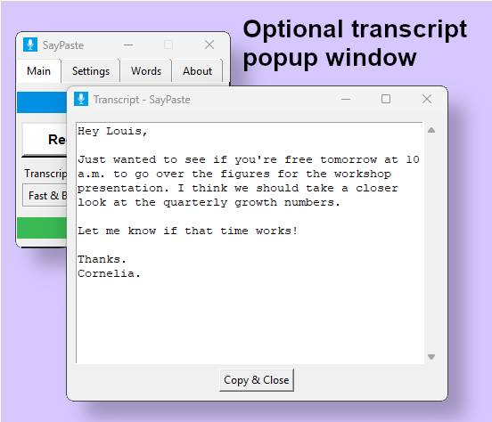 适用于 Windows 的语音到文本转换应用程序。 100%本地化。 100%容易。 SayPaste AI 在后台默默工作,仅在您要求时聆听。只需按一个键盘快捷键即可开始录制,然后按另一个键盘快捷键即可停止并转录。转录后,结果会立即复制到剪贴板,无需手动复制。只需将其粘贴到需要的地方即可。