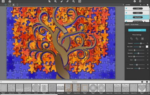 使用“自动生成”进入包含形状的库,或使用自定义按钮导入您自己的形状。移动形状并调整其大小,然后应用以从拼图中切出形状。使用导入照片工具更改一个或一组拼图上的照片。这种技术非常适合文本和徽标。