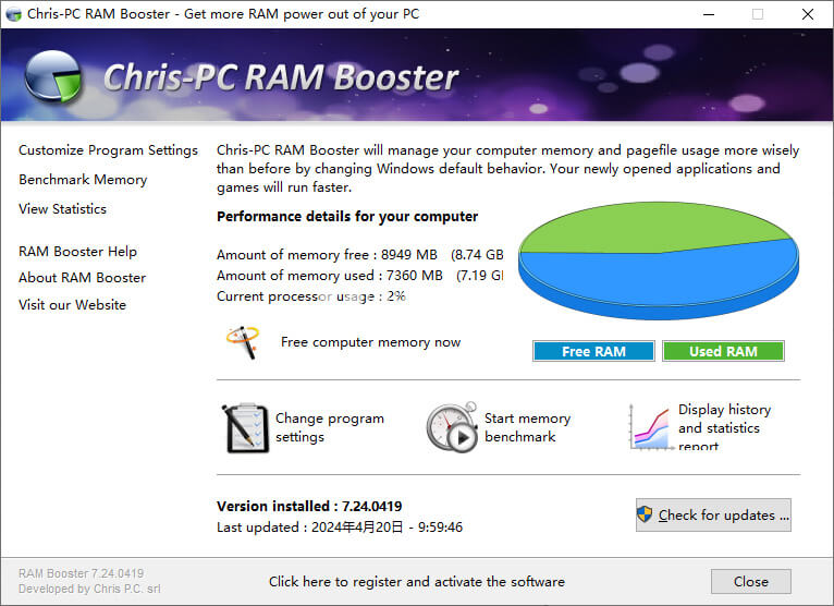 Chris PC RAM Booster使用为用户提供一个更友好直观的计算机内存管理和分配功能,借助它,您的内存管理经过调整以保持计算机稳定性,并且更注重计算机性能。轻松监控并管理计算机安装,自动去欸的那个并保持内存释放,保障计算机性能不被影响,你会发现你的电脑就像最近重新启动一样,所有的程序、游戏和其他软件立即加载并顺利运行。
