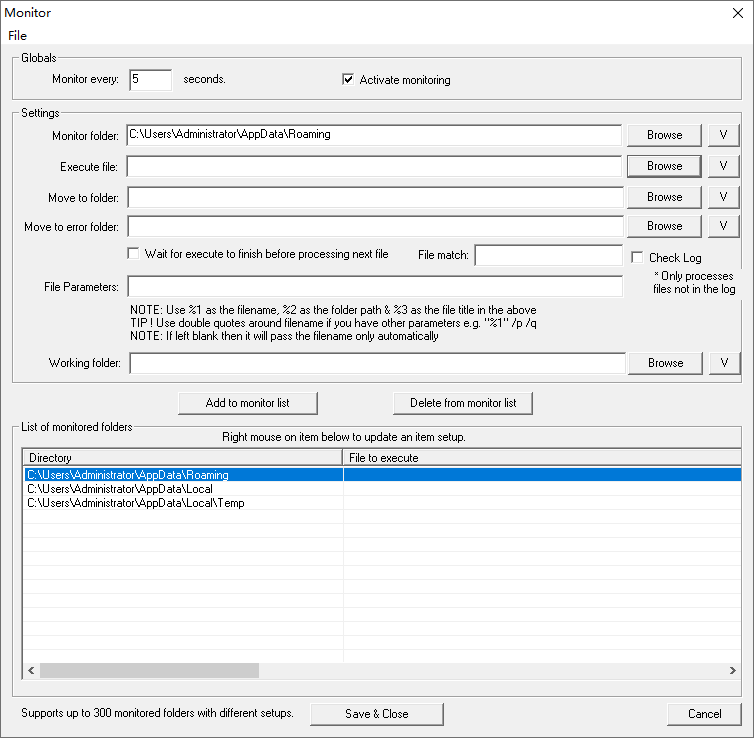 当检测到新文件时,软件会采取指定的操作,其中可以包括从将文件移动到其他位置,到触发以某种方式处理文件的工作流程或脚本或 exe。